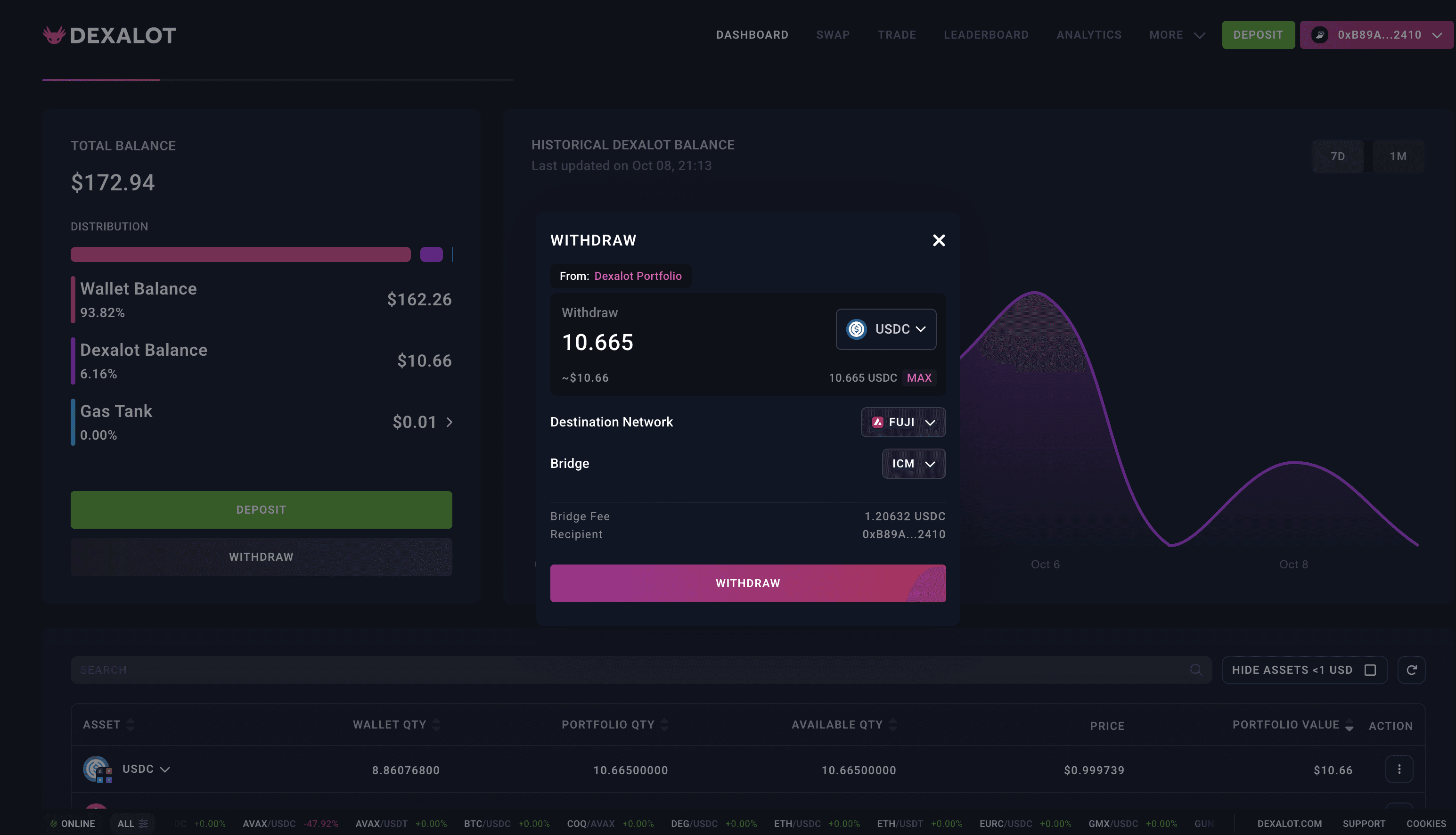 The Avalanche L1 (Dexalot) we used was highly specialized for our use case and very cheap. We actually got all the gas token ALOT we needed airdropped, just for bridging assets over. The only fees we had to pay were for bridging. Usually, we would not have done this for a single operation, so these costs do not occur for a single trade, but only for depositing and withdrawing from the portfolio.